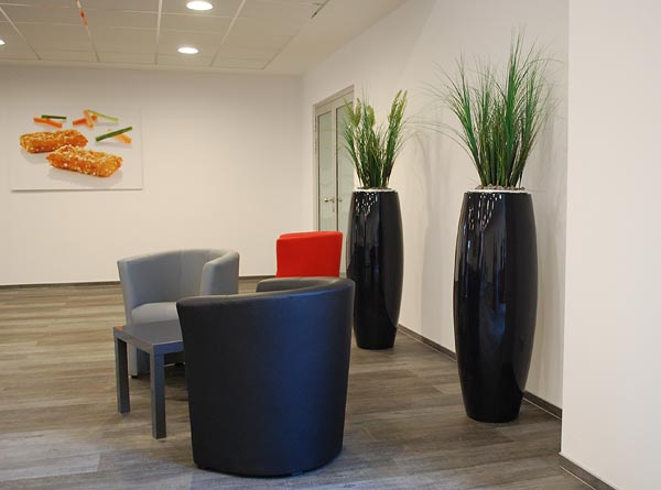Im Unterschied dazu wirken XXL-Pfanzkübel auch in kleineren Räumen nicht überdimensioniert, wenn der Raum ansonsten nicht vollgestellt ist. Das folgende Beispiel zeigt eine weitere Variante des Pflanzkübels MAGNUM aus Fiberglas, der die stattliche Höhe von 116 cm erreicht und hier in schwarzem Hochglanz vor der weißen Wand Akzente setzt.